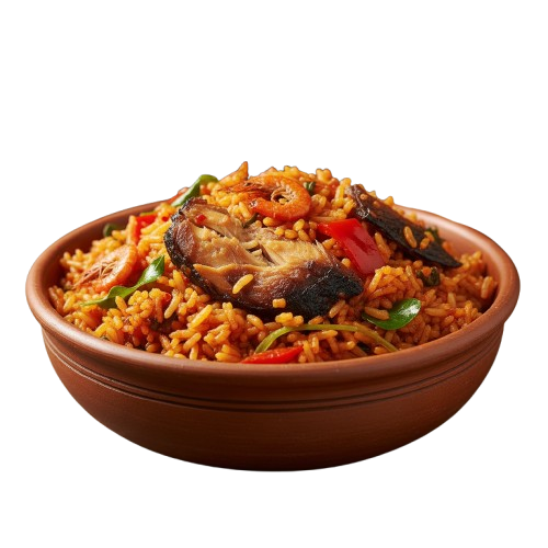 Golden native rice prepared with palm oil, smoked fish, and local spices. This dish delivers deep flavor and a rich, home-cooked feel β truly Nigerian.